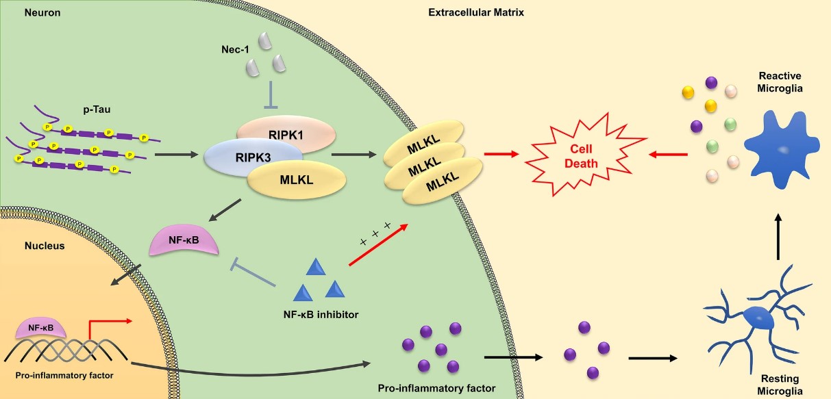 阿尔茨海默病(Alzheimer's disease, AD)是全球影响最广、老年人中最为常见的慢性发展的神经退行性疾病。临床表现为认知和记忆功能不断恶化,日常生活能力缓慢减退。然而目前的治疗手段仅能改善AD患者症状,无法从根本上阻断疾病进程,因此阐明AD的发病机制对于药物的研发具有十分重要的意义。神经原纤维缠结(Neurofibrillary tangles, NFTs)是AD的主要病理学特征之一,由过度磷酸化的tau蛋白组成。过度磷酸化的tau蛋白会破坏微管的稳定性,影响轴突运输并损伤神经元,然而磷酸化的tau导致神经元死亡的具体机制仍需进一步阐明。程序性坏死是一种被分子有序调控但却具有坏死特征的程序性细胞死亡,先前研究表明AD患者脑内调控程序性坏死的关键因子RIPK1显著上调,MLKL二聚化增加,但AD脑内的程序性坏死是如何被触发的以及相关调控机制并不明确。因此,本研究团队首先确认了磷酸化的tau蛋白可以在小鼠海马神经元HT22及人神经母瘤SY-SY5Y中上调RIPK1、RIPK3和MLKL,促进坏死体的形成进而引发程序性坏死。接下来通过转录组测序结果表明在磷酸化tau诱导的坏死过程中伴随显著的炎症因子上调,同时CRISPR-Cas9敲除实验证明炎症反应由RIPK1-RIPK3-MLKL轴所介导。进一步研究发现NF-κB信号通路响应RIPK1-RIPK3-MLKL轴的激活从而促进多种炎症因子的转录。体内实验也证实,RIPK1的抑制剂Nec-1s在AD模型鼠中的治疗抑制了程序性坏死的发生和小胶质细胞的激活,缓解了模型鼠的记忆和认知损伤。