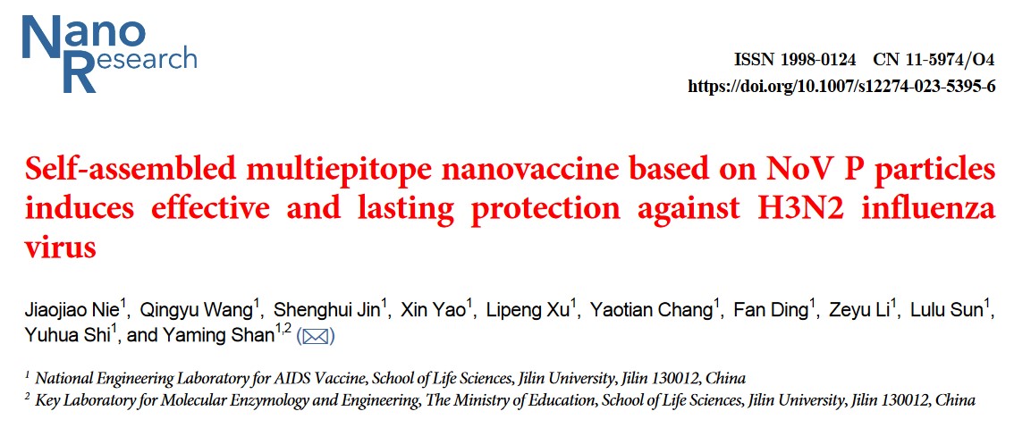 艾滋病疫苗国家工程实验室单亚明教授团队,在通用型流感疫苗研究领域取得新进展。相关研究内容以“Self-assembled multiepitope nanovaccine based on NoV P particles induces effective and lasting protection against H3N2 influenza virus”为题,于2023年2月16日在学术期刊《Nano Research》正式发表。