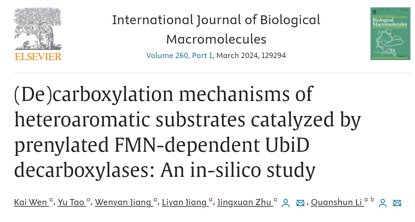 分子酶学工程教育部重点实验室李全顺教授团队立足于国家双碳战略,基于计算机辅助策略,系统探究“碳”高值转化酶UbiD脱羧酶催化杂环底物脱羧/羧化反应的理论机制。以UbiD可逆脱羧酶催化CO2固定,同时能够实现高价值羧化产物杂芳族羧酸的生产,在医学、农业和化工行业中具有极高的应用价值。本研究中,以计算模拟策略为工具,确定了羧化反应中的质子转移步骤是整个可逆脱羧/羧化反应的限速步骤,为采用“稳定过渡态”策略进行UbiD酶的分子改造与设计提供理论支撑。相关研究“(De)carboxylation mechanisms of heteroaromatic substrates catalyzed by prenylated FMN-dependent UbiD decarboxylases: An in-silico study”发表于国际学术期刊International Journal of Biological Macromolecules。论文第一完成单位为果冻传媒