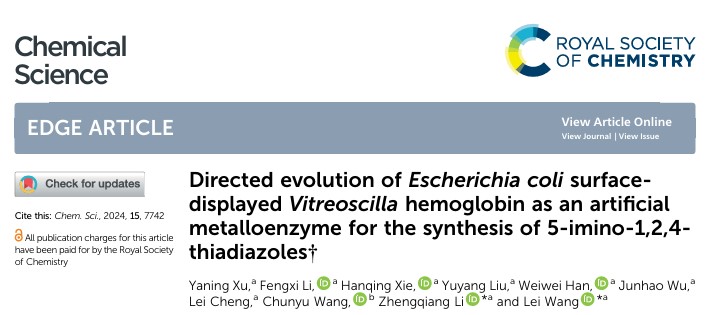 分子酶学工程教育部重点实验室的王磊教授课题组致力于研究利用人工酶催化实现绿色高效有机合成,以《Directed evolution of Escherichia coli surface-displayed Vitreoscilla hemoglobin as an artificial metalloenzyme for the synthesis of 5-imino-1,2,4-thiadiazoles》为题在国际期刊Chemical Science发表研究论文。该研究团队通过将钴卟啉辅因子替代原有的血红素辅因子并与大肠杆菌膜蛋白串联表达,后经过两轮组合活性位点饱和突变/迭代饱和突变(CAST/ISM)策略的定向进化成功构建了一种具有六个位点突变的新型人工VHb硫脲氧化酶(ATOase)的全细胞催化剂,并将其应用于5-亚氨基-1,2,4-噻二唑的合成。其催化活性显著提高,具有广泛的底物适用性。文章中利用全细胞催化体系可简化人工金属酶的构建与筛选过程,同时该方法可以较大程度保持酶的活性以提高酶的催化速率。这项研究不仅展示了VHb作为人工金属酶在新反应中的潜力,该文章中构建人工金属酶全细胞催化剂的研究思路还为其他新型人工酶的开发提供了新的策略,对于推动酶促绿色有机合成领域的发展具有重要意义。论文第一完成单位为果冻传媒