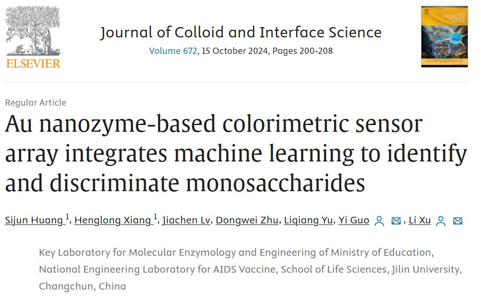 分子酶学工程教育部重点实验室徐力教授、郭轶教授团队报道了基于金纳米酶比色传感器阵列集成机器学习识别和区分单糖的方法。由于不同的单糖表现出不同的氧化还原特性,而金纳米酶可以应用O2、ABTS+•或[Ag(NH3)2]+作为电子受体,以不同的速度催化不同的单糖氧化,并引起不同的显色反应。以此建立的传感器阵列可以产生交叉响应信号,所收集的信号通过线性判别分析(LDA)和层次聚类分析(HCA)来实现不同的单糖或其混合物的区分。此外,可以应用基于传感器阵列的神经网络回归模型同时预测样品中不同单糖浓度。研究论文“Au nanozyme-based colorimetric sensor array integrates machine learning to identify and discriminate monosaccharides”发表在国际学术期刊《Journal of Colloid and Interface Science》上。论文第一完成单位为果冻传媒