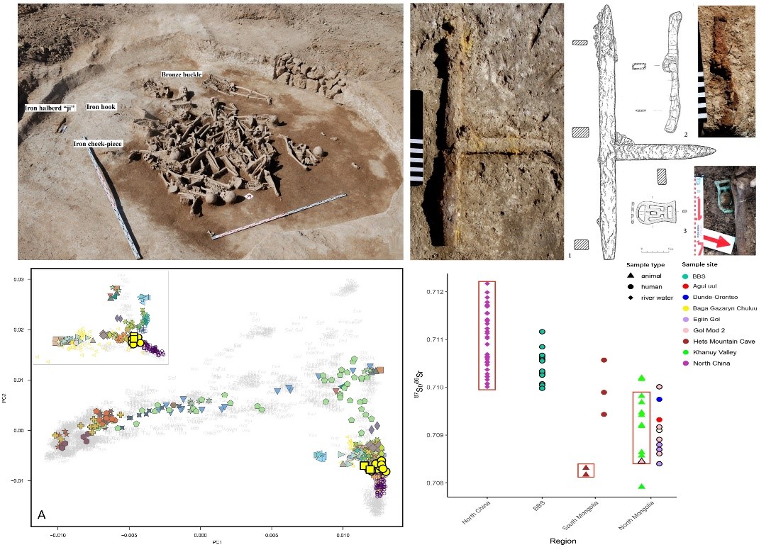 汉匈战争是早期欧亚大陆东部历史上的重要事件,但受限于文献记载的匮乏与零散,对战争中参战士兵身份、双方军队构成及战略部署等信息缺乏全面的认知。本研究聚焦蒙古国巴彦布拉格遗址的一处乱葬坑,通过交叉学科方法,系统整合考古人类学鉴定,古基因组测序、锶同位素分析以及碳氮稳定同位素检测的成果,为还原战争细节提供了突破性证据。