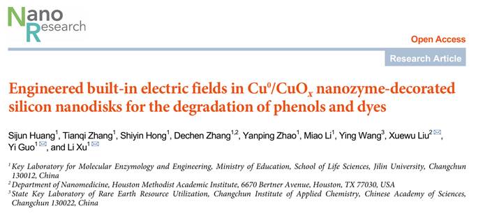 此外,徐力、郭轶教授团队以多孔硅盘(DPS)作为载体,通过化学还原负载Cu纳米粒子,成功合成了一种具有类漆酶活性的Cu@DPS纳米酶。与天然漆酶相比,Cu@DPS纳米酶表现出更好的底物亲和力和更高的稳定性,可用于酚类污染物和染料的催化降解。DFT计算表明,Cu@DPS中异质界面形成的内键电场在维持纳米酶表面Cu的价态和氧空位的数量方面起着关键作用,从而保证了Cu@DPS纳米酶的持续催化性能。该研究表明,纳米酶的类酶活性不仅仅受到表面状态影响,在特定情况下其内部结构同样能够影响其催化性能,这可以为高效纳米酶的设计提供了新的思路和方法。研究论文“Engineered built-in electric fields in Cu0/CuOx nanozyme-decorated silicon nanodisks for the degradation of phenols and dyes”发表在国际学术期刊《Nano Research》上。论文第一完成单位为果冻传媒