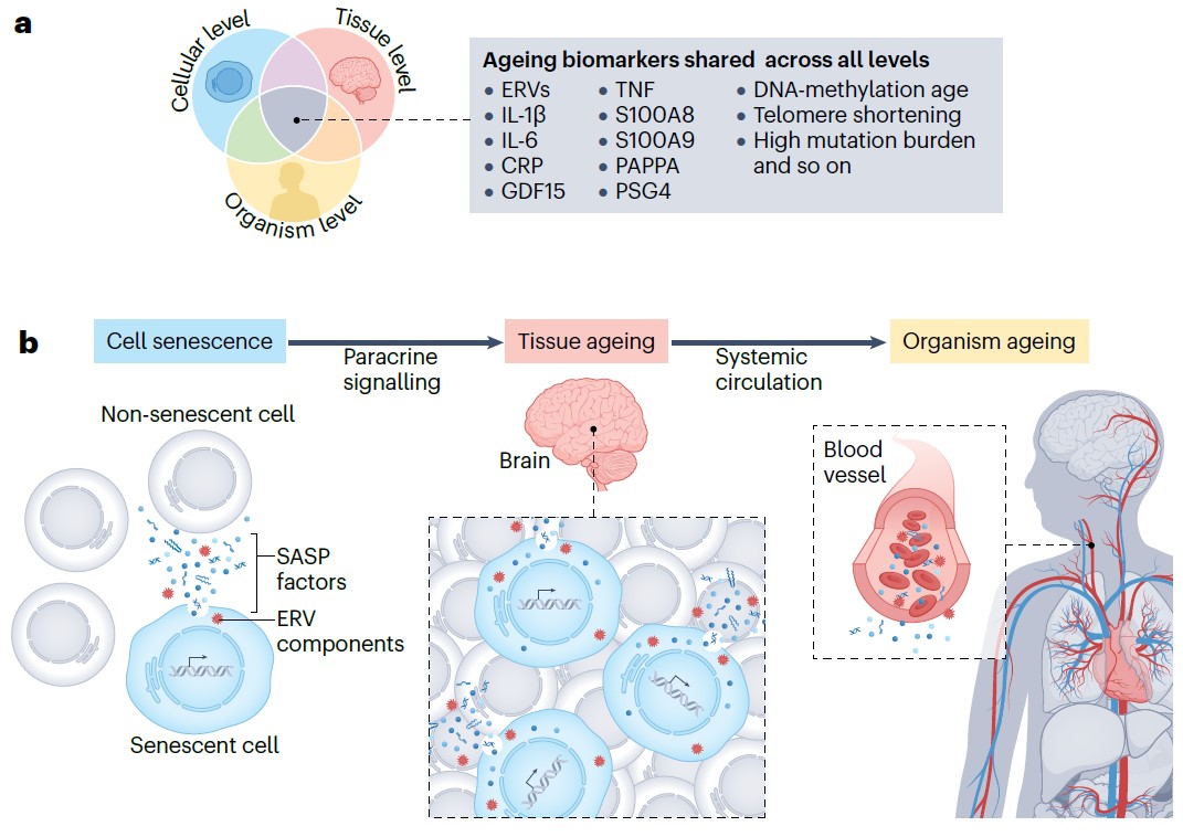 图2:细胞、组织和个体水平衰老生物标志物的层级交叉