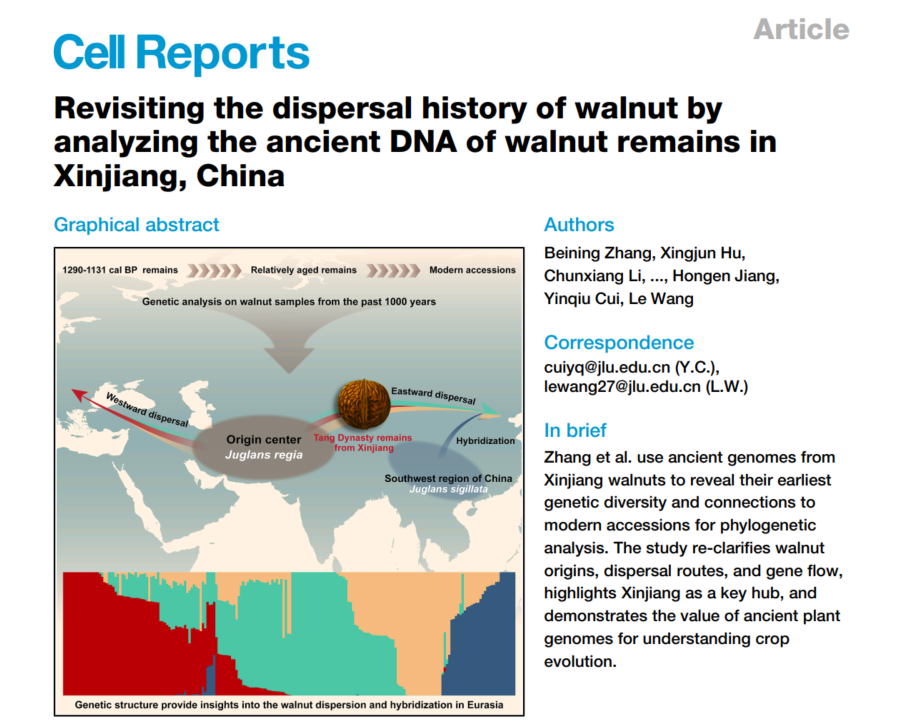崔银秋教授与植物科学学院王乐副教授团队利用古DNA技术成功获取了世界首例古代核桃全基因组数据,并综合运用古基因组学与群体遗传学分析手段系统揭示了核桃(Juglans regia)在丝绸之路上的传播路径及遗传演化特征。该研究不仅填补了核桃古基因组数据的空白,更为揭示丝绸之路上关键经济作物的传播历史与驯化轨迹提供了直接的分子证据。该研究成果以“Revisiting the dispersal history of walnut by analyzing the ancient DNA of walnut remains in Xinjiang,China”为题,在国际权威学术期刊《Cell Reports》上发表。果冻传媒