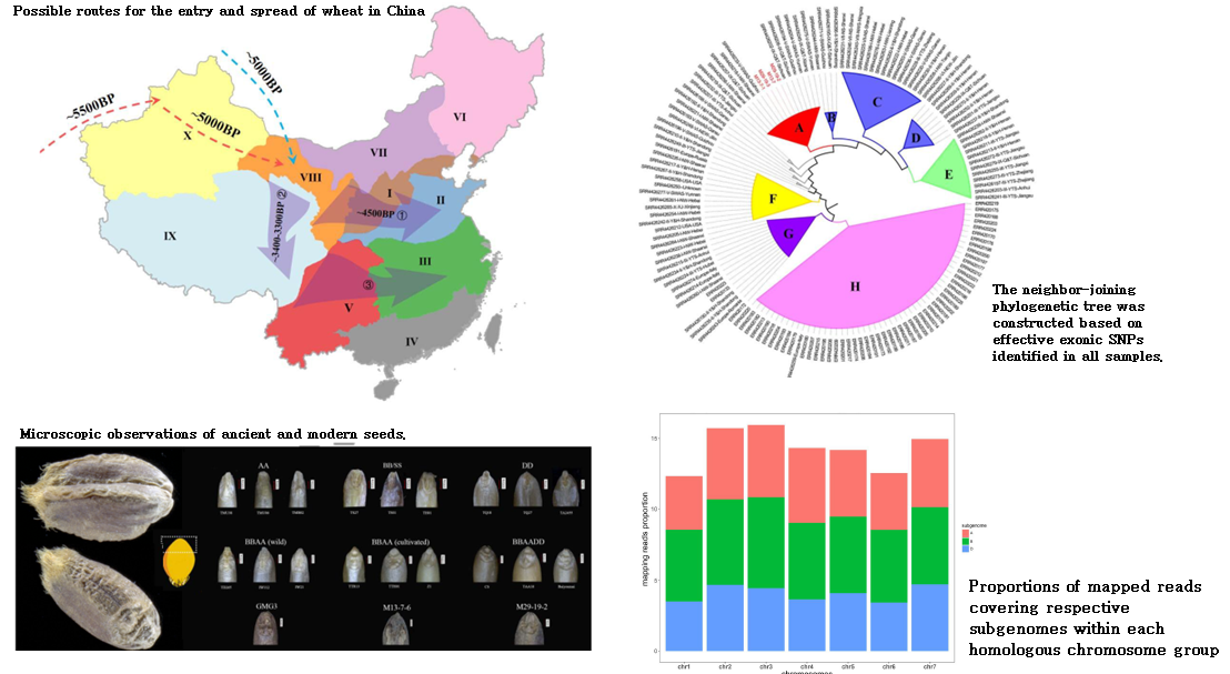 崔银秋教授团队克服了古植物中DNA含量极低、降解损伤严重的困难,从距今3800年的单粒小麦种子中成功提取到其基因组DNA,并利用新一代测序技术对中国新疆小河和古墓沟墓地出土的七粒古代小麦种子进行了全基因组测序和序列组装。基因组数据分析和形态学观察均证明出土的小麦为六倍体普通小麦;通过与来自中国以及世界各地的现代六倍体小麦品种的RNA-seq数据进行系统发育分析,证明了古代小麦与中国西南地区现存的普通小麦地方品种的密切关系。青藏高原现代地方品种与古代小麦高度相似的等位基因频率为小麦向高原传播的西南途径提供了更加直接以及有力的分子依据,同时本研究也提出了普通小麦从青藏高原边缘到长江流域的扩散路线。此外,该研究结果为中国种植的现存小麦地方品种的栽培起源,扩散和遗传改良提供了重要信息。