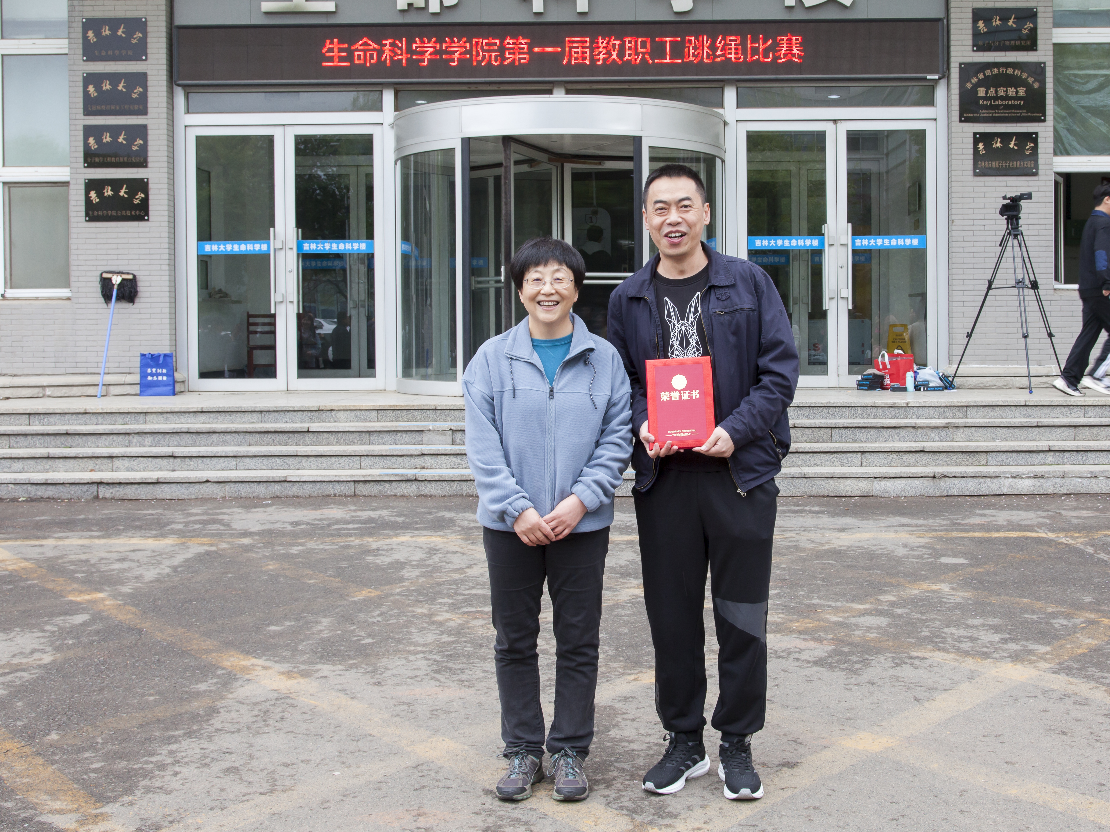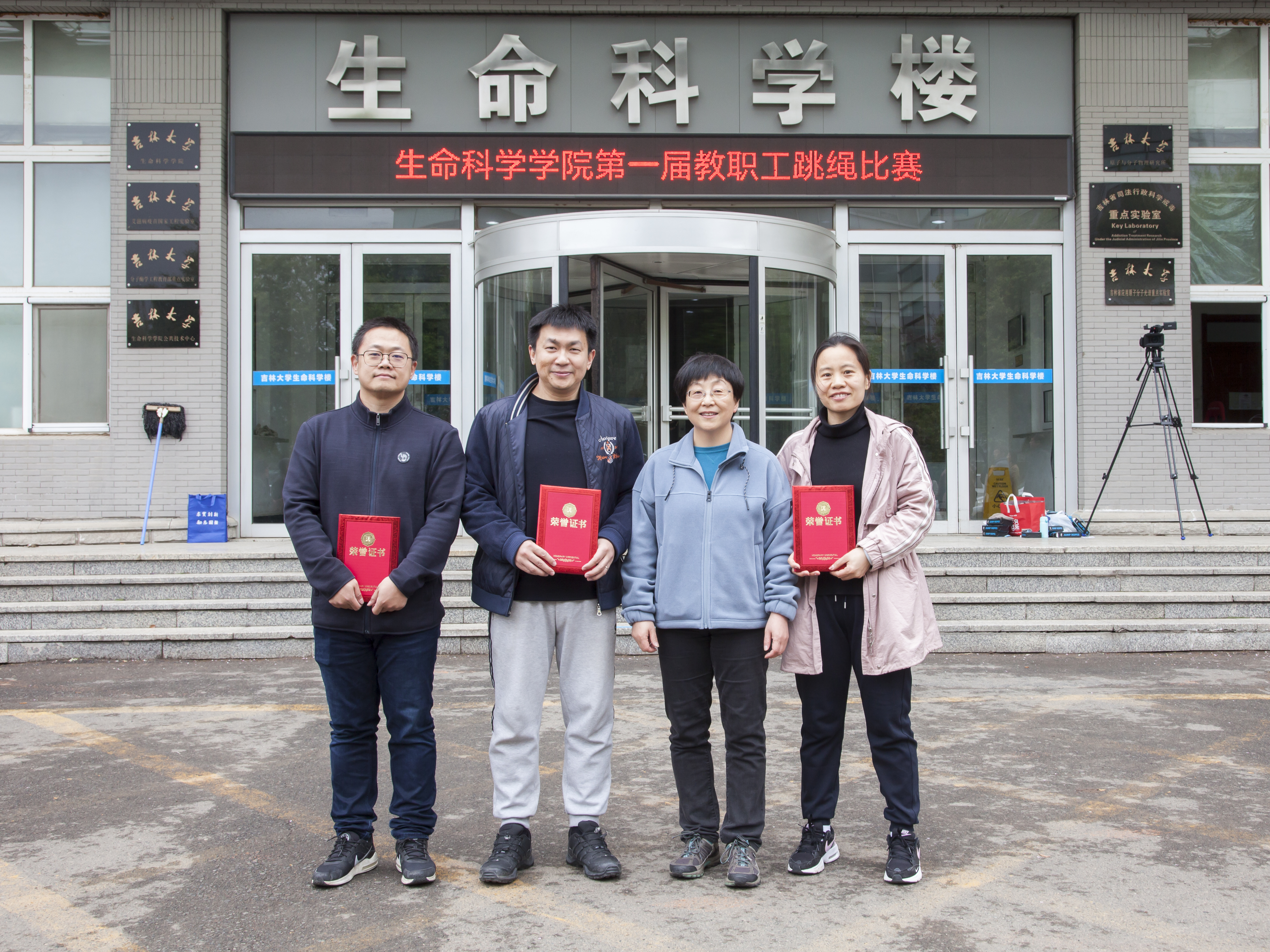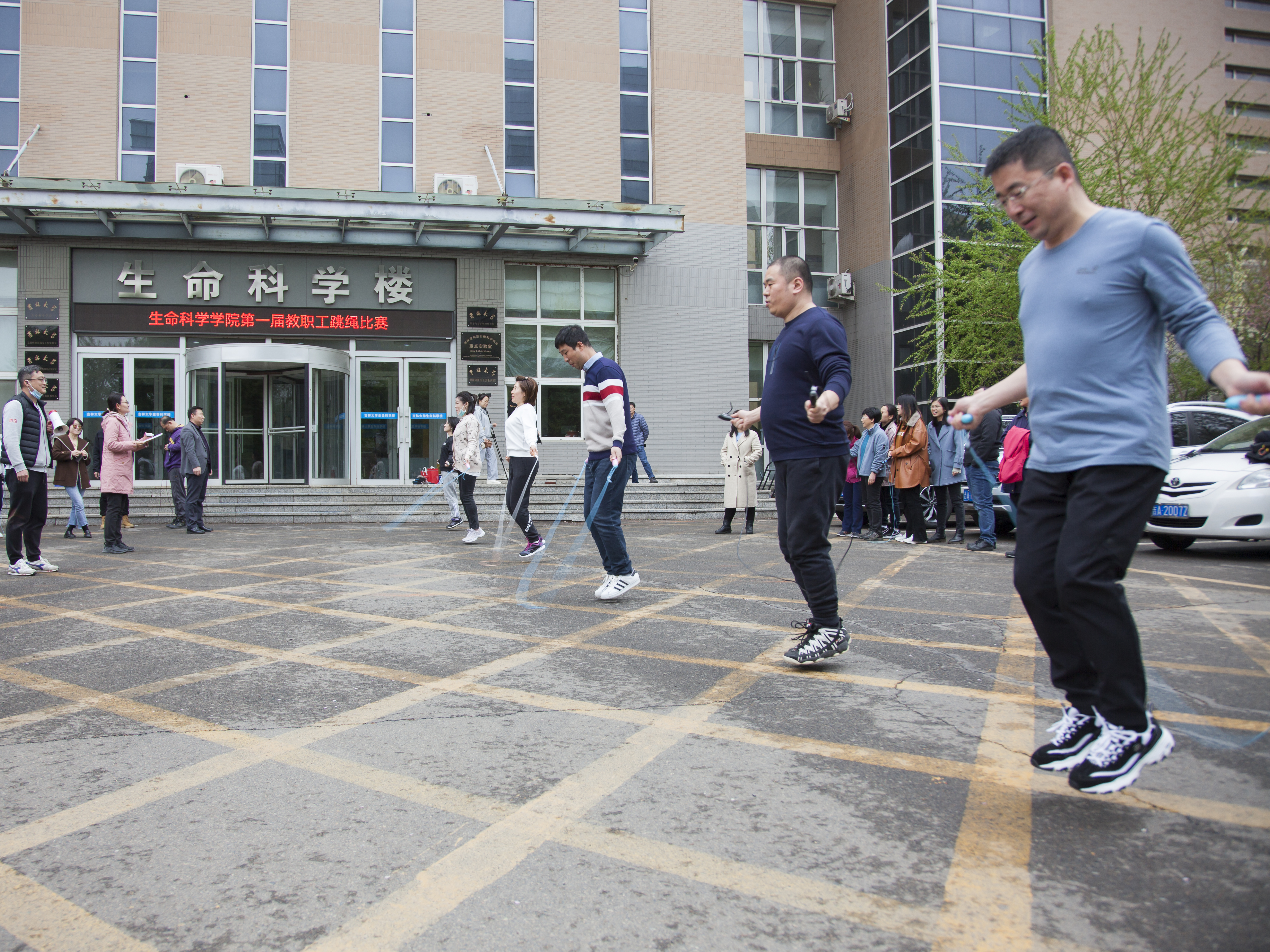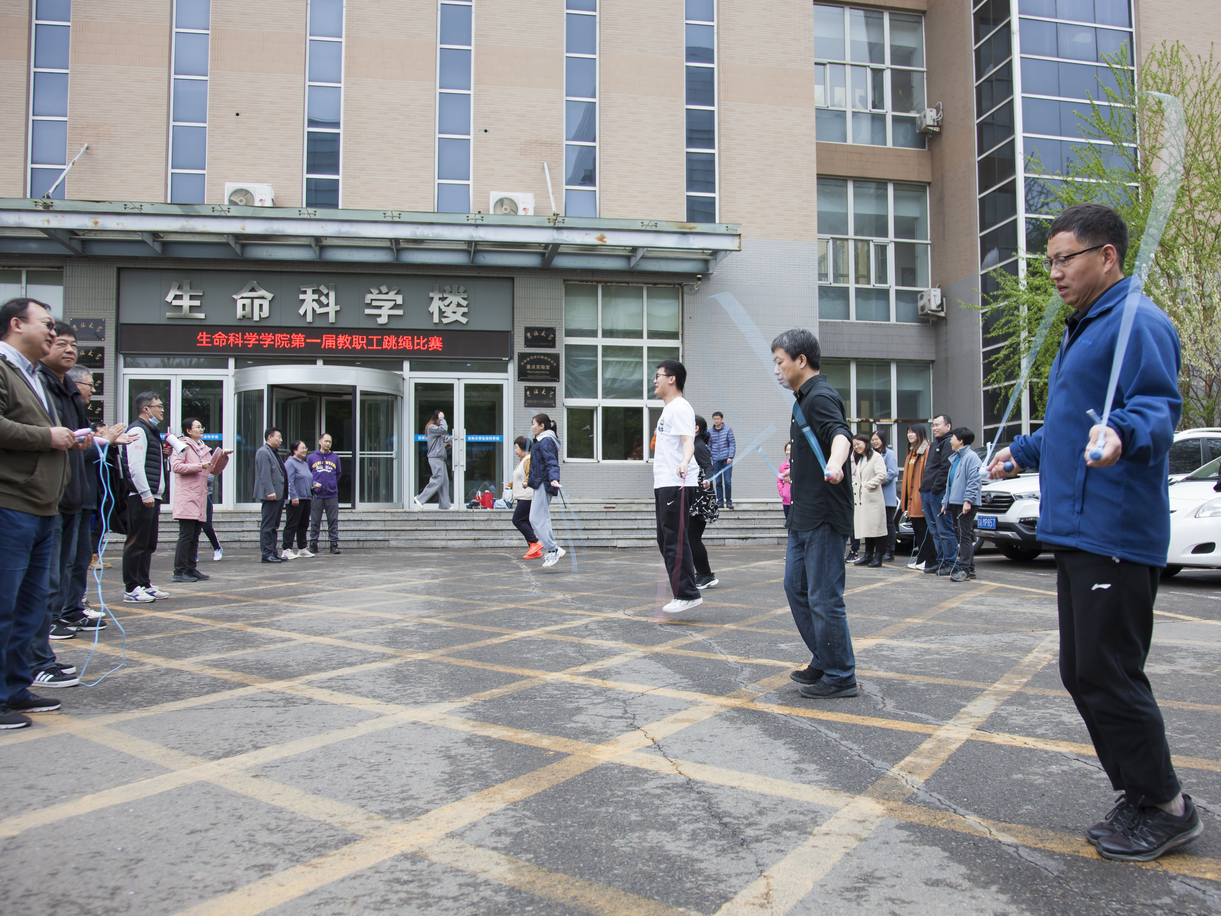 于4月28日中午在生命科学楼前举办“爱Life”系列活动(十一)——首届教职工跳绳比赛。
