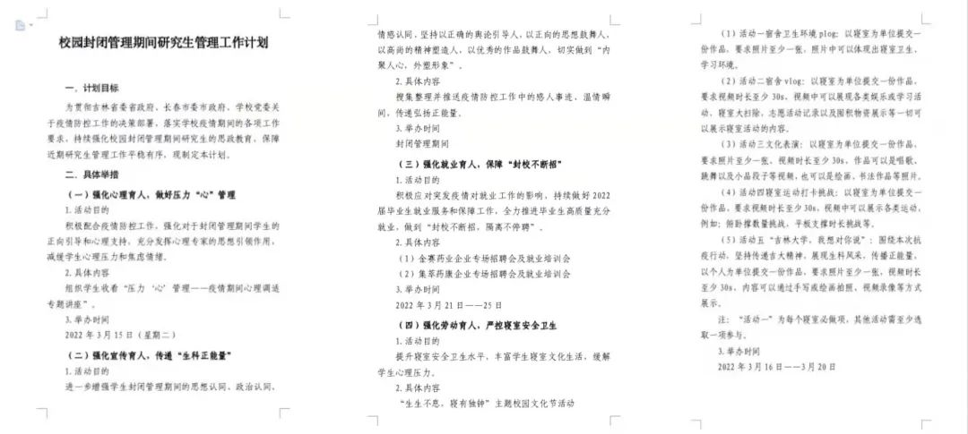 “科学应对,精准施策。”学院积极配合学校做好物资保障、统筹管理、核酸检测、排查管控等工作,紧急制定校园封闭管理期间学生管理工作计划,做到严格管控、精准施策。