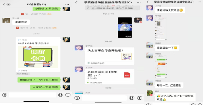 为加强全面疏导和精准指导,全体班主任与学工队伍不断创新工作方法,积极回应学生关切、解决学生诉求,通过专业化的心理辅导、亲情化的思想关怀、常态化的教育引领,引导学生平和心态、阳光战“疫”。结合重要时间节点,通过组织主题班会、小组会议,谈心谈话等形式,就学生关心的考研、保研、就业、毕业设计等问题进行逐一回应,为学生答疑解惑、排忧解难;通过自制接龙小程序、组建学习小组、开展线上打卡、撰写抗疫日记等方式,引导学生缓解紧张情绪、合理规划时间,加强体育运动和自我管理。