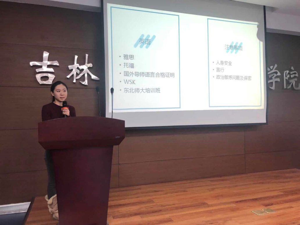 李佩瑶,现任我校马克思主义学院师资博士后,2016年至2017年国家公派至美国约翰霍普金斯大学联合培养。李珮瑶老师首先讲解了自己是如何选择留学国别和留学单位的,而后讲解了如何做好留学前的准备以及需要参加的外语考试。李珮瑶老师通过分享在外留学期间的照片,为同学们展示了丰富多彩的留学生活以及不同于国内学习的生活体验。她强调,留学期间需要有很高的独立自主性,要对自己的学习进度有明确的规划。同时提醒同学们在外留学期间要注意人身安全、妥善处理人际关系等。