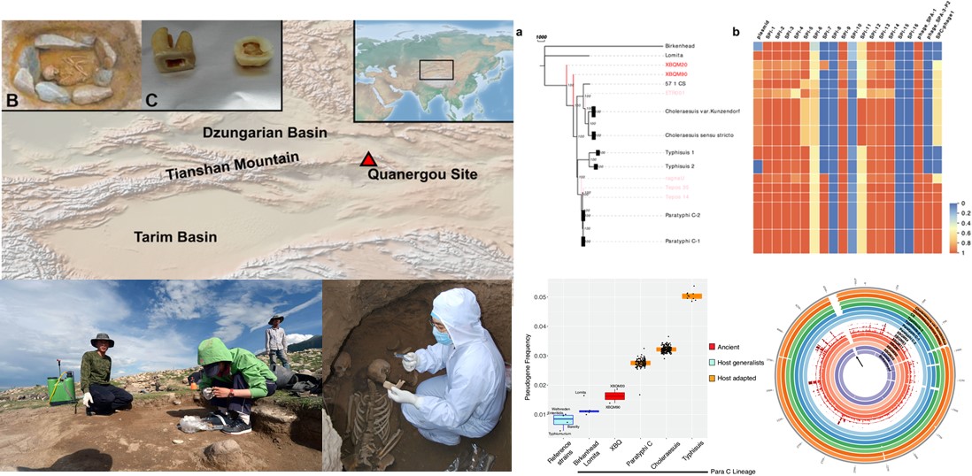图.新疆泉儿沟遗址的地理位置以及获取的古代沙门氏菌基因组系统发育分析