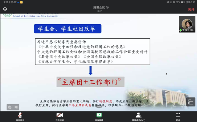 在腾讯会议平台开展2020年学生代表大会。学院党委副书记崔帅、团委书记丁子芮、2019级兼2020级辅导员齐鹏及130余名学生代表参加会议。