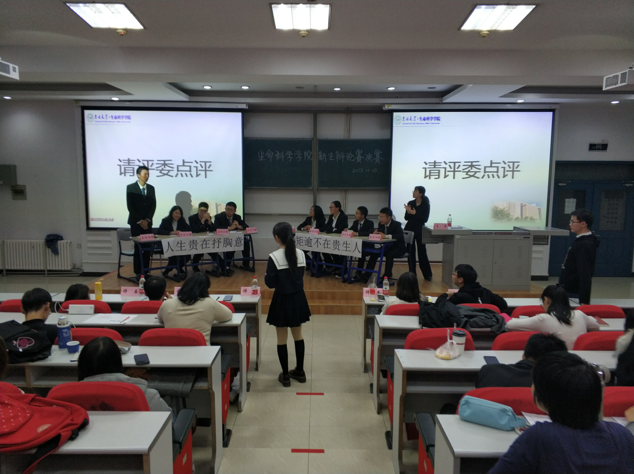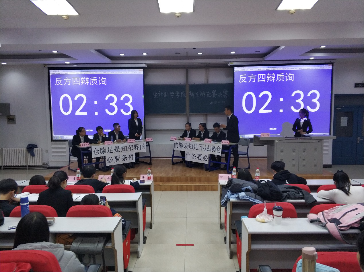 为锻炼学生的思维逻辑和语言表达能力,培养团队协作能力,形成勤于思考、敢于思辨、善于思辨、积极探索的良好氛围,生命科学学院开展了为期一个月的新生杯辩论赛。10月28号晚上六点,辩论赛决赛在经信教学楼第三阶梯教室举行。进入决赛的班级有2018级八班,2018级二班,2018级三班和2018级四班。决赛由2015级张诗音、黄振轩,2016级刘乃彰、董泳辰、李鑫担任评委。