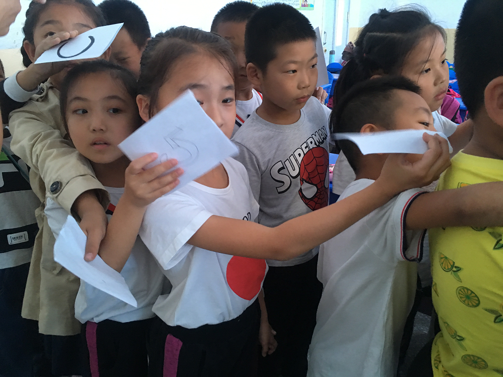 为了能更好地解释DNA的双螺旋结构,宣讲团队给每一位孩子制作了一个代表碱基的小卡片,以游戏线索的形式告诉他们A和T配对,C和G配对,首先让孩子们站成一列,然后通过线索互补配对,一只手牵住配对的同伴表示碱基互补配对形成的氢键,另一只手搭在前面同学的肩膀上表示磷酸二酯键,共同形成一段有遗传效应的DNA片段。