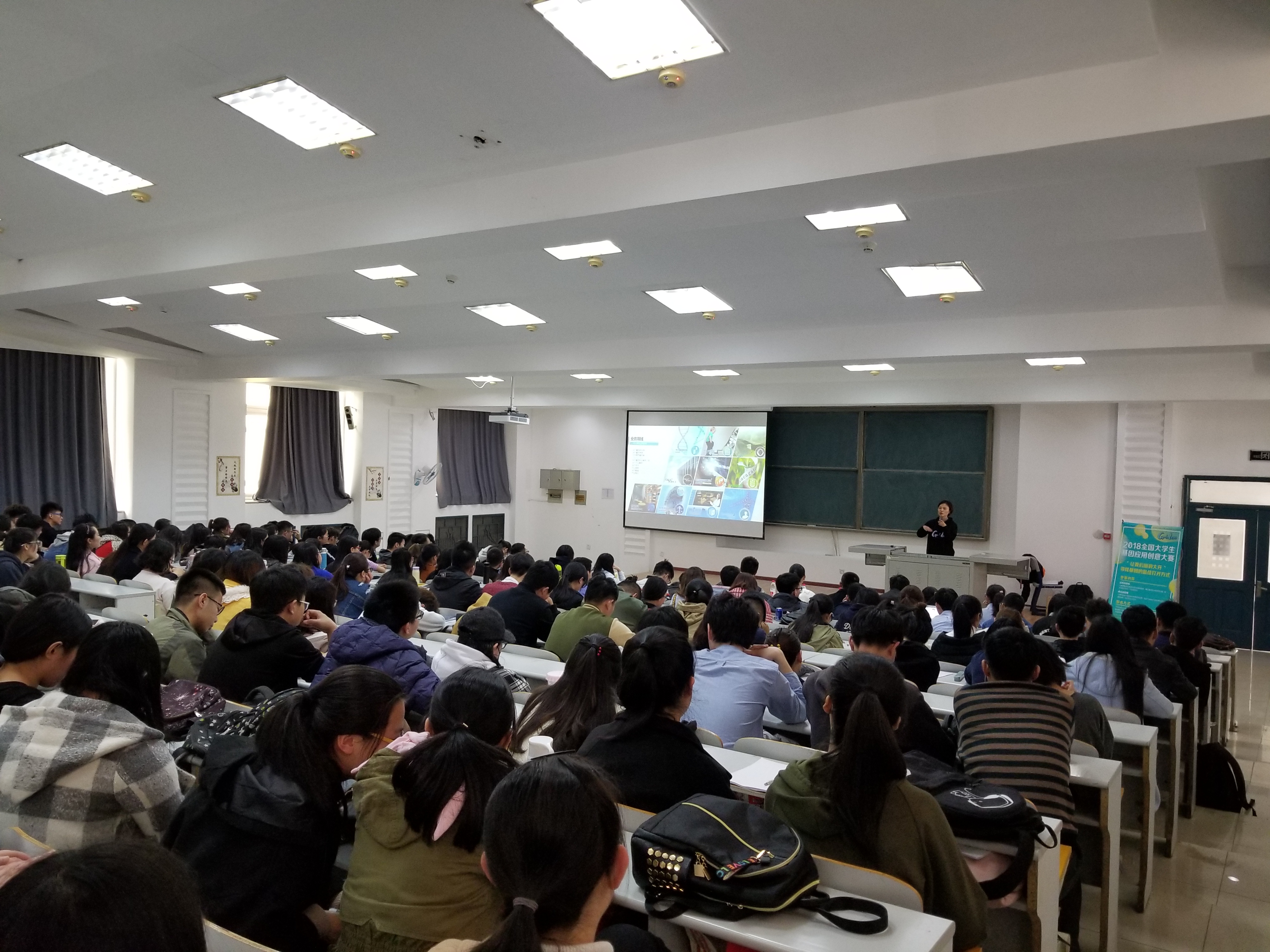 联合华大基因于3月30日中午在经信教学楼F6阶内举行了华大基因2018年全国大学生基因应用创意大赛的宣讲会。果冻传媒