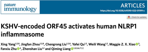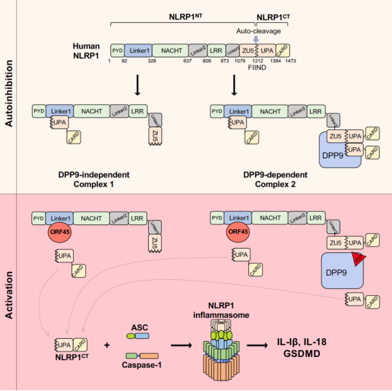 图1. KSHV结构蛋白ORF45激活NLRP1炎症小体的分子机制