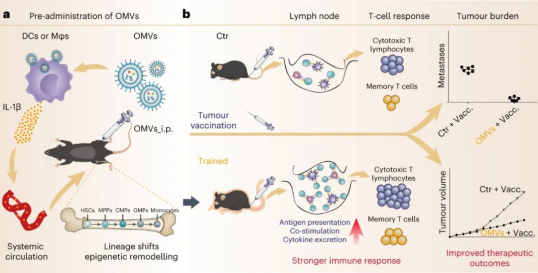 研究人员将大肠杆菌来源的外膜囊泡(OMV)通过腹腔注射方式免疫小鼠,验明了免疫原性与安全性。预先施用 OMV 显著增强了抗原呈递细胞对后续肿瘤疫苗的反应。